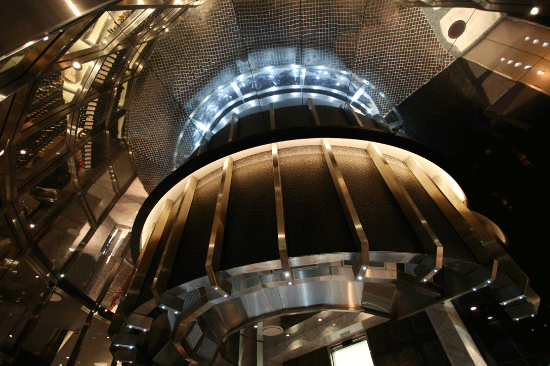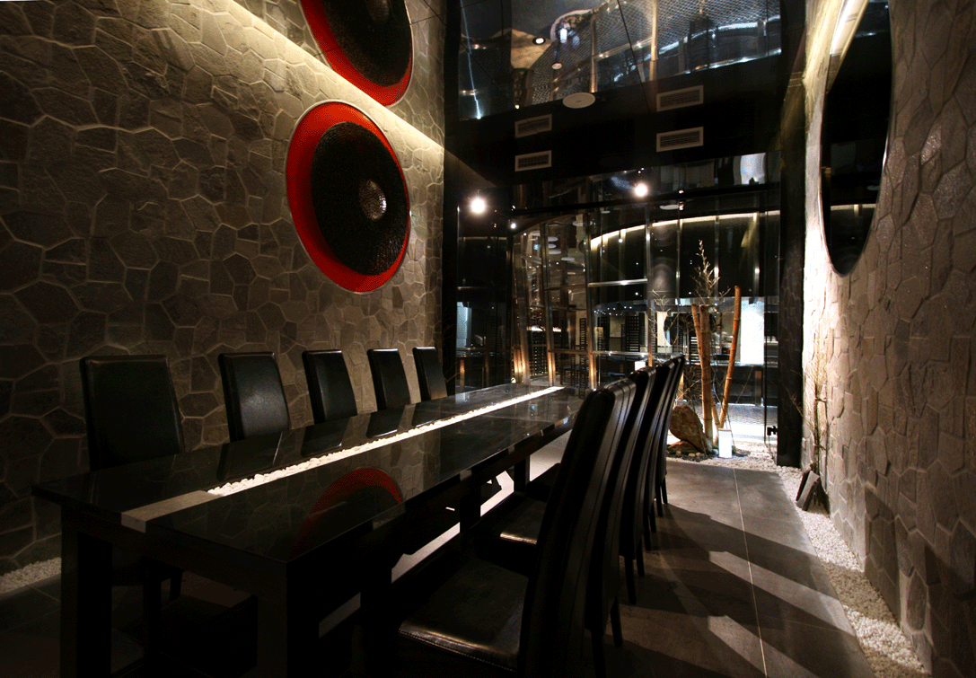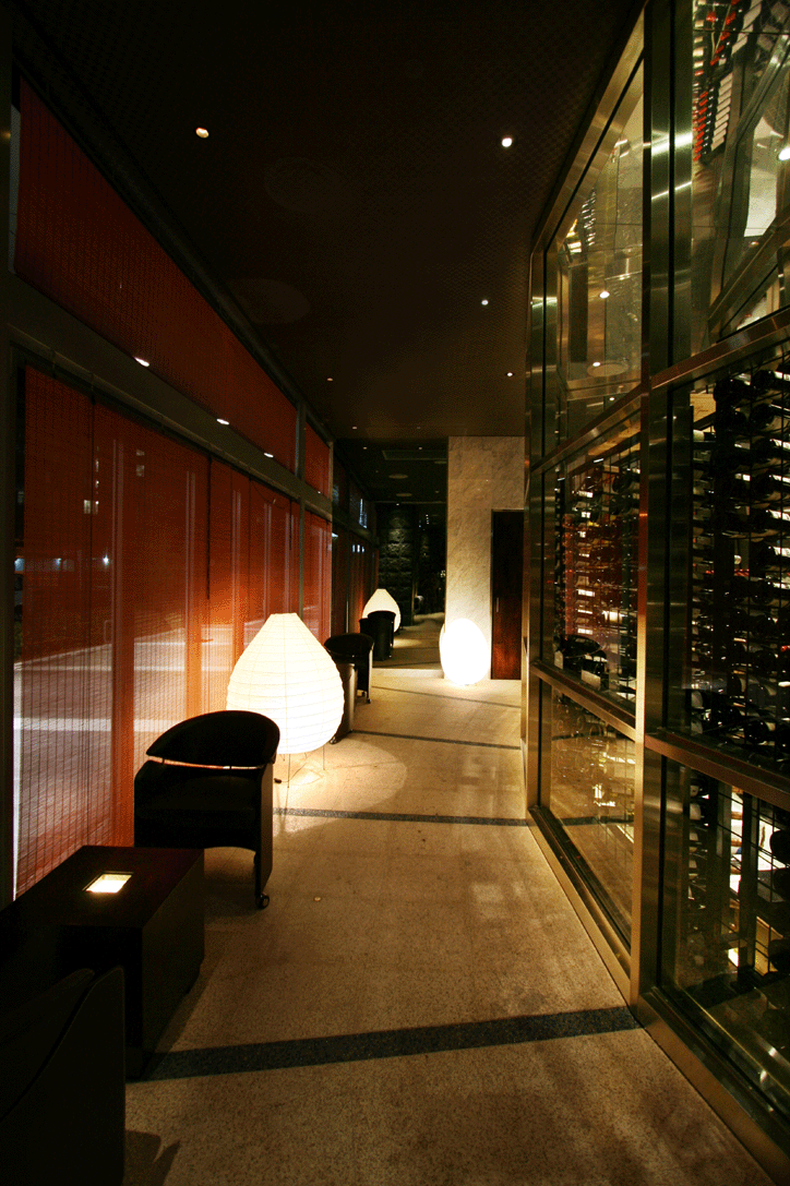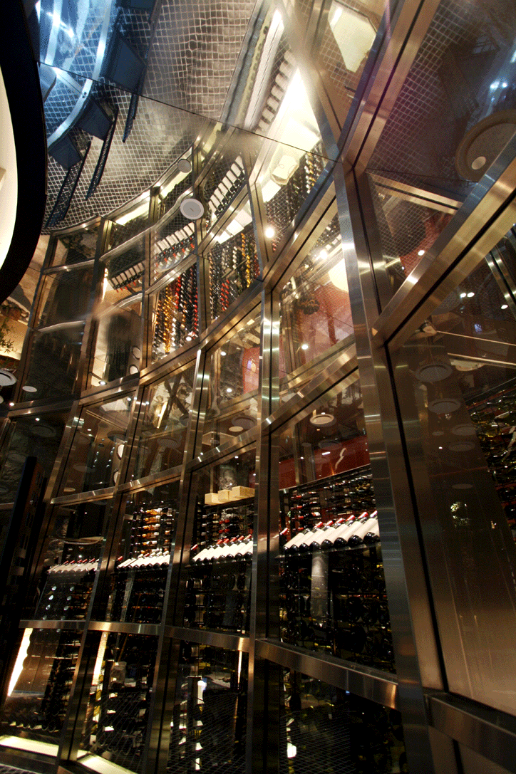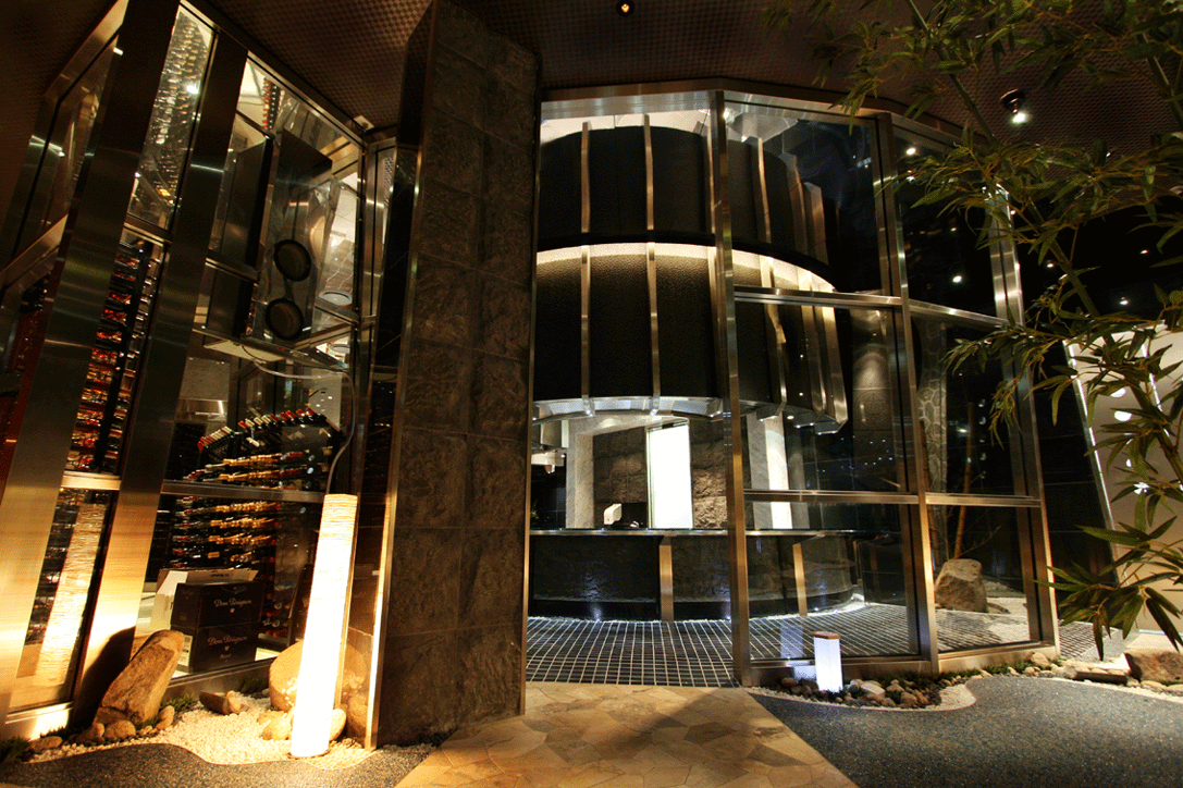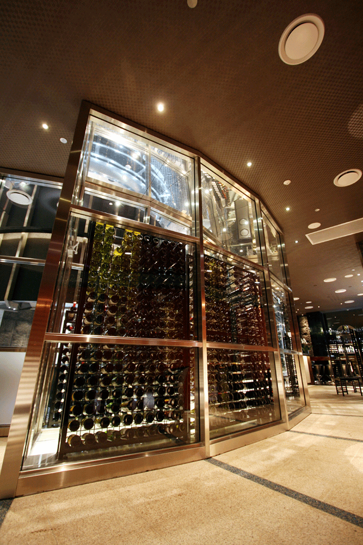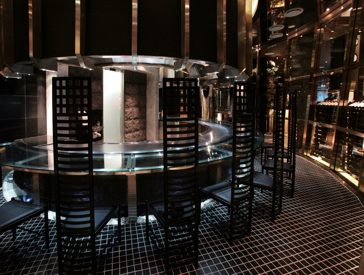 ↑鉄板焼エリアを円弧状に囲むステンレス格子とワインセラー