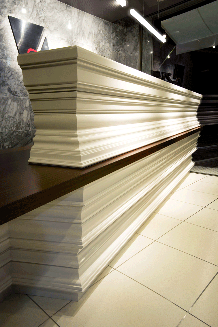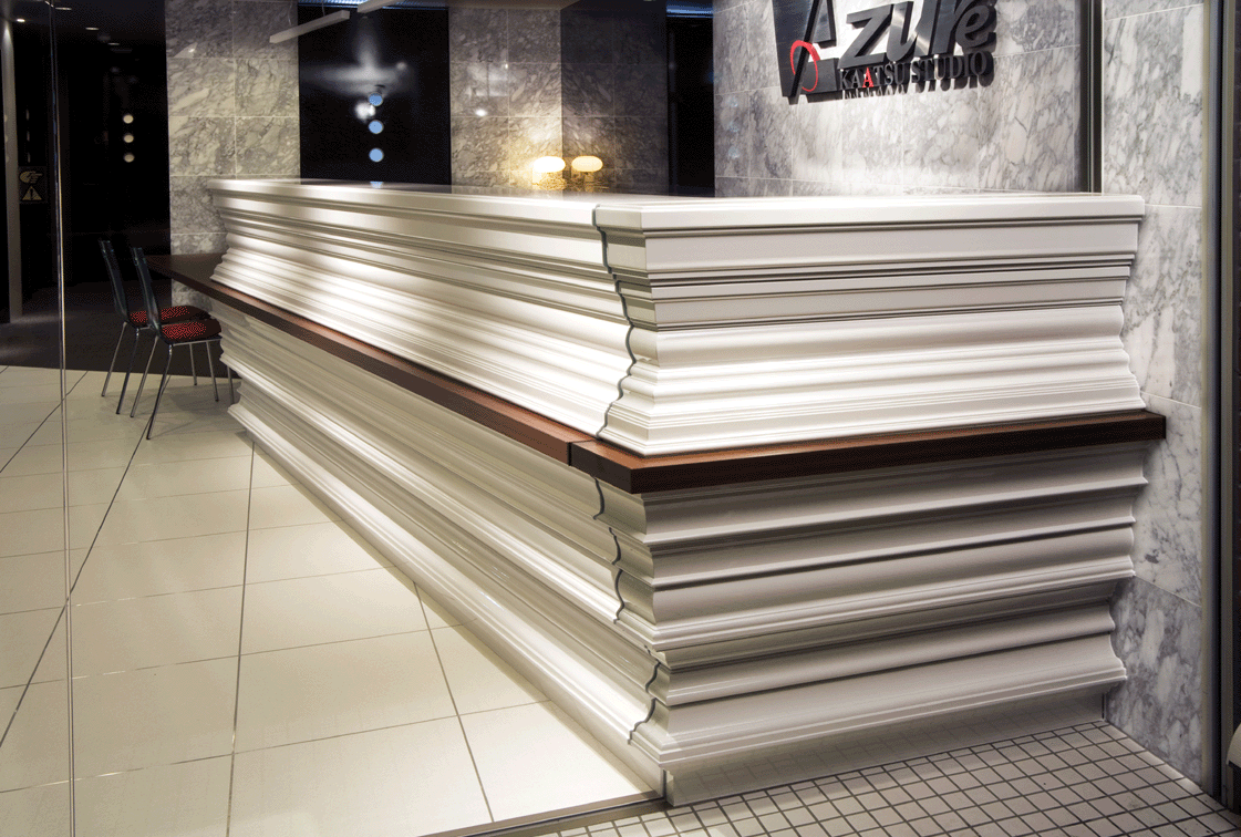 ↑木製モールディング(廻り縁)を積層したカウンター外面↑