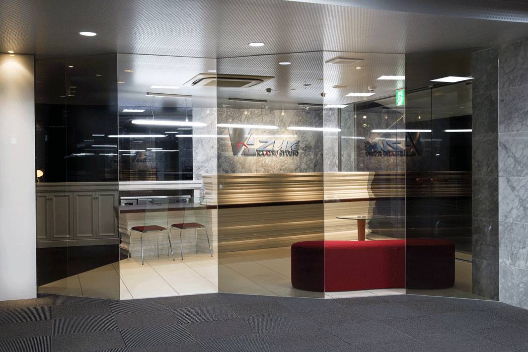 ↑スタジオとエントランスを間仕切る屏風状のガラス壁↑