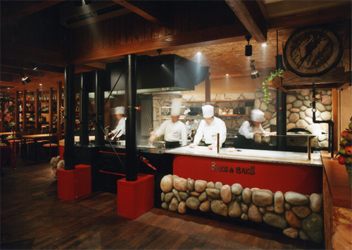 よく見る一般的なオープンキッチ ンはステンレス製の調理器を並べた厨房を見せるだけのものであり、それは裏方作業を利用客へ見せているだけに過ぎませんが、当社はオープンキッチンを空間の核と 位置づけ、店内のエンターテイメント性を高めることの出来る装置として演出することで、飲食店の本質的な部分に付加価値を与え、より訴求力のある店舗づくりを実現します。