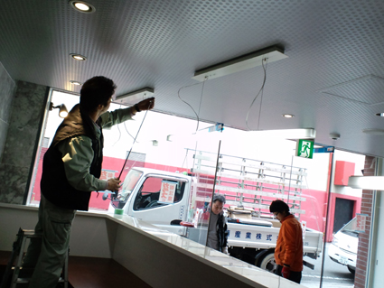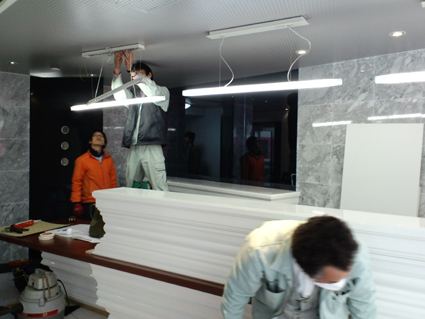 ↑受付カウンター上の吊り下げ照明の高さを調整しています↑