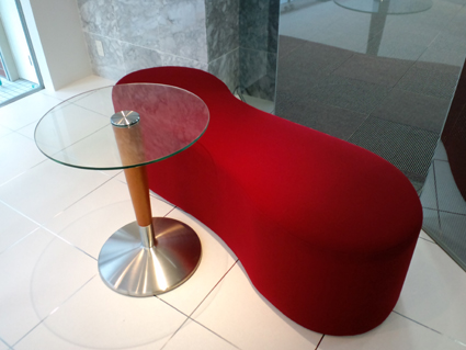 ソファーのフォルムは背面のガラスの角度に合わせて作っています。