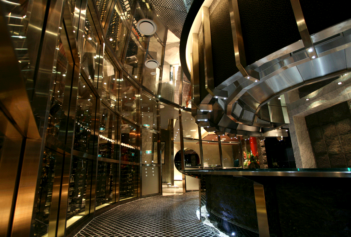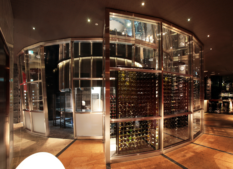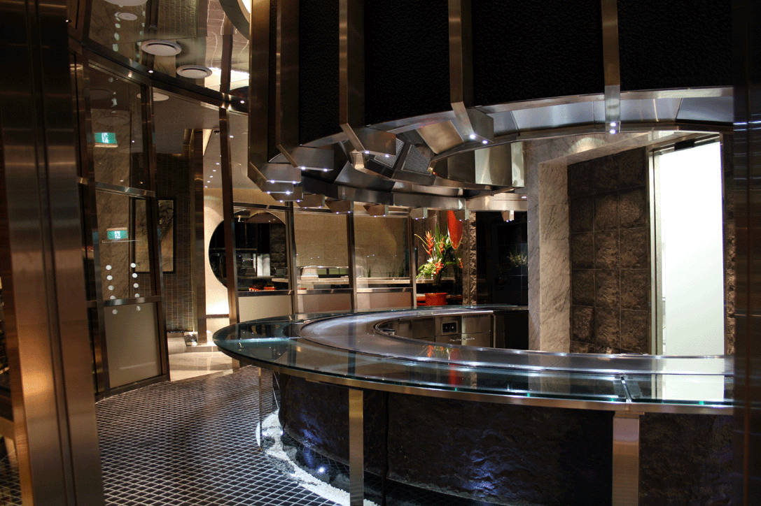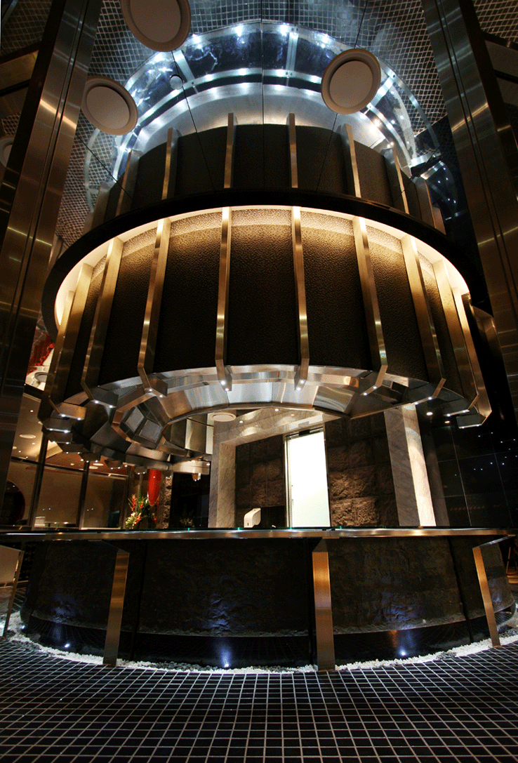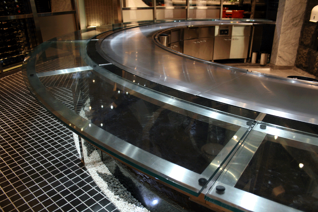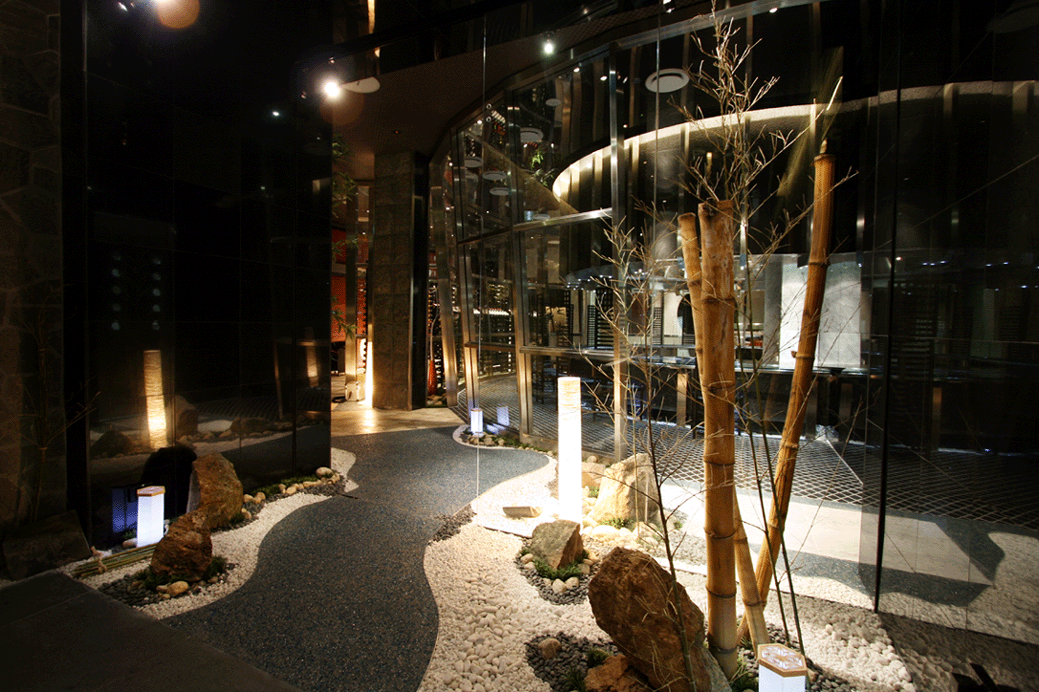 ↑入口のドアを開けると滝があり、池にかかる透明ガラスの橋を渡って店内へ