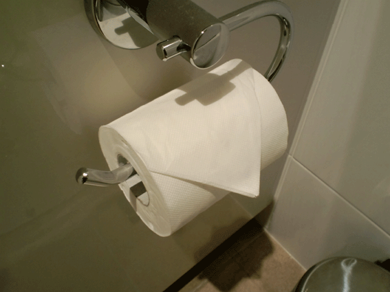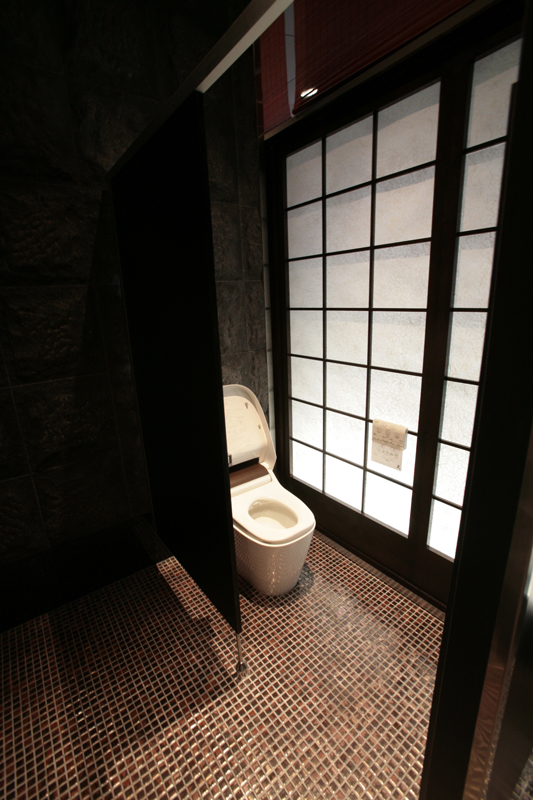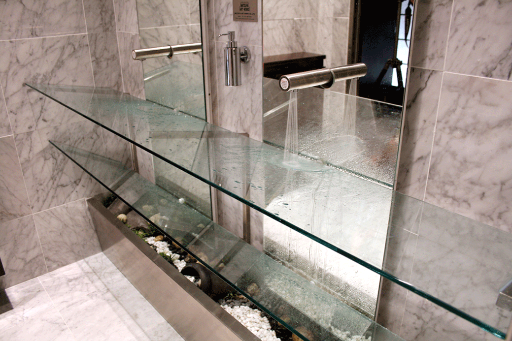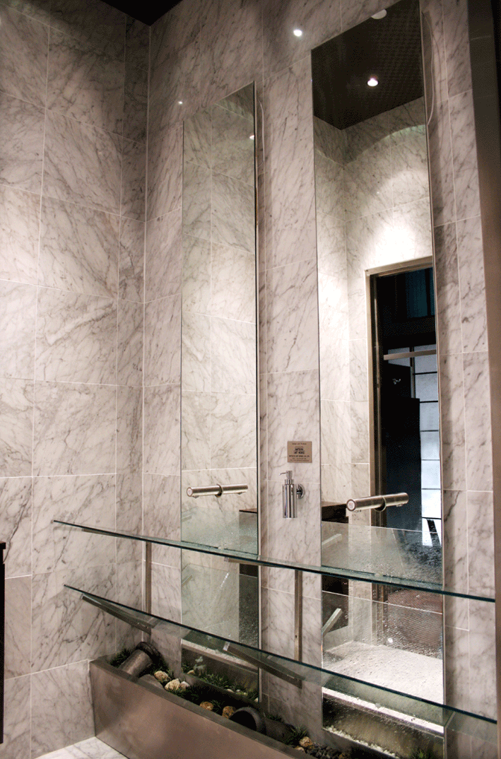 ↑トイレの床面ガラスからエントランスの水面が見えます