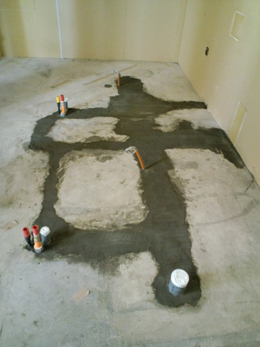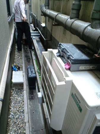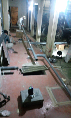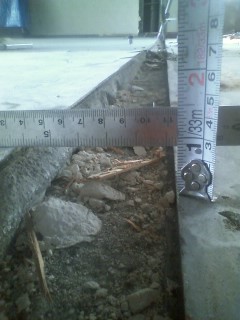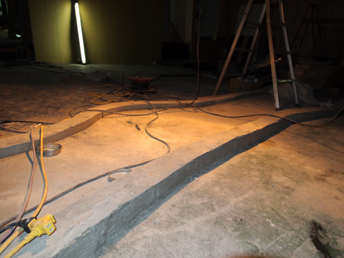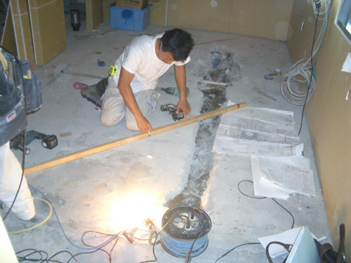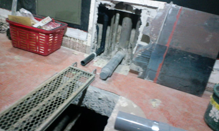 ↓地面のコンクリートを削って、シャンプー台の給水・排水管を仕込みます。