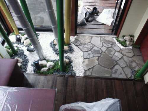 ↑カフェ エントランスに造園のディスプレイを作ってます。