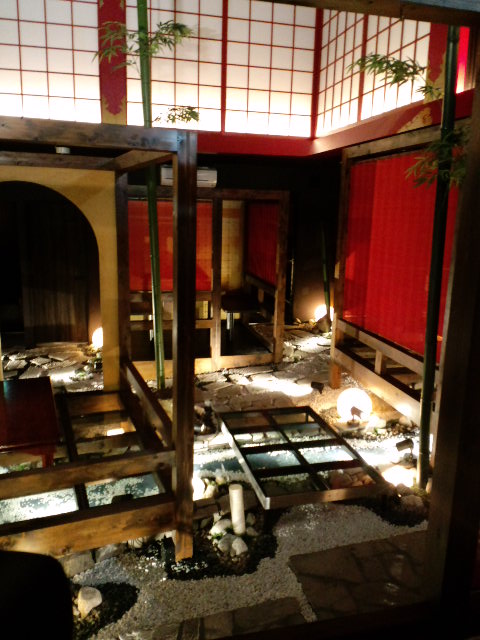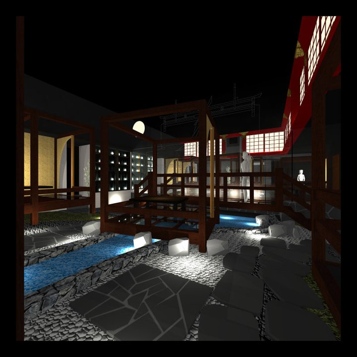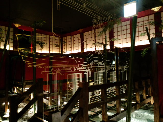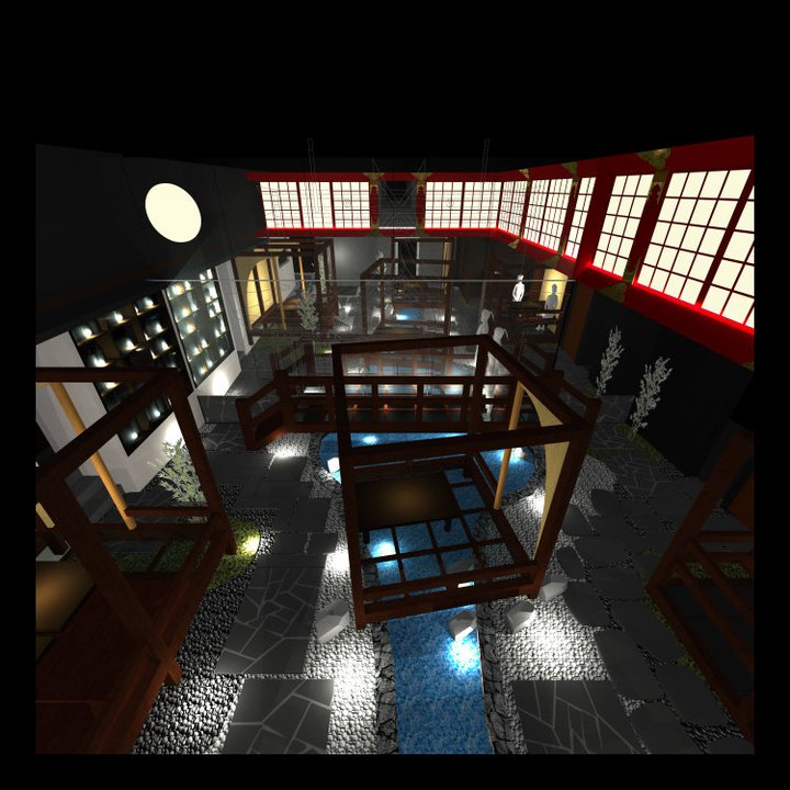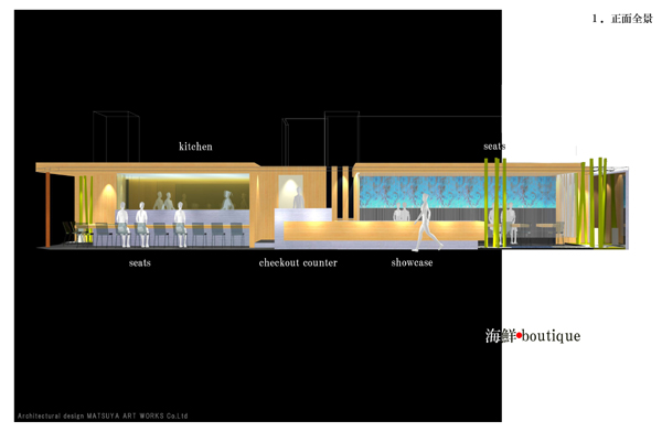 ↑店内には川を流します。川と池の上にガラス床の個室を作ります。